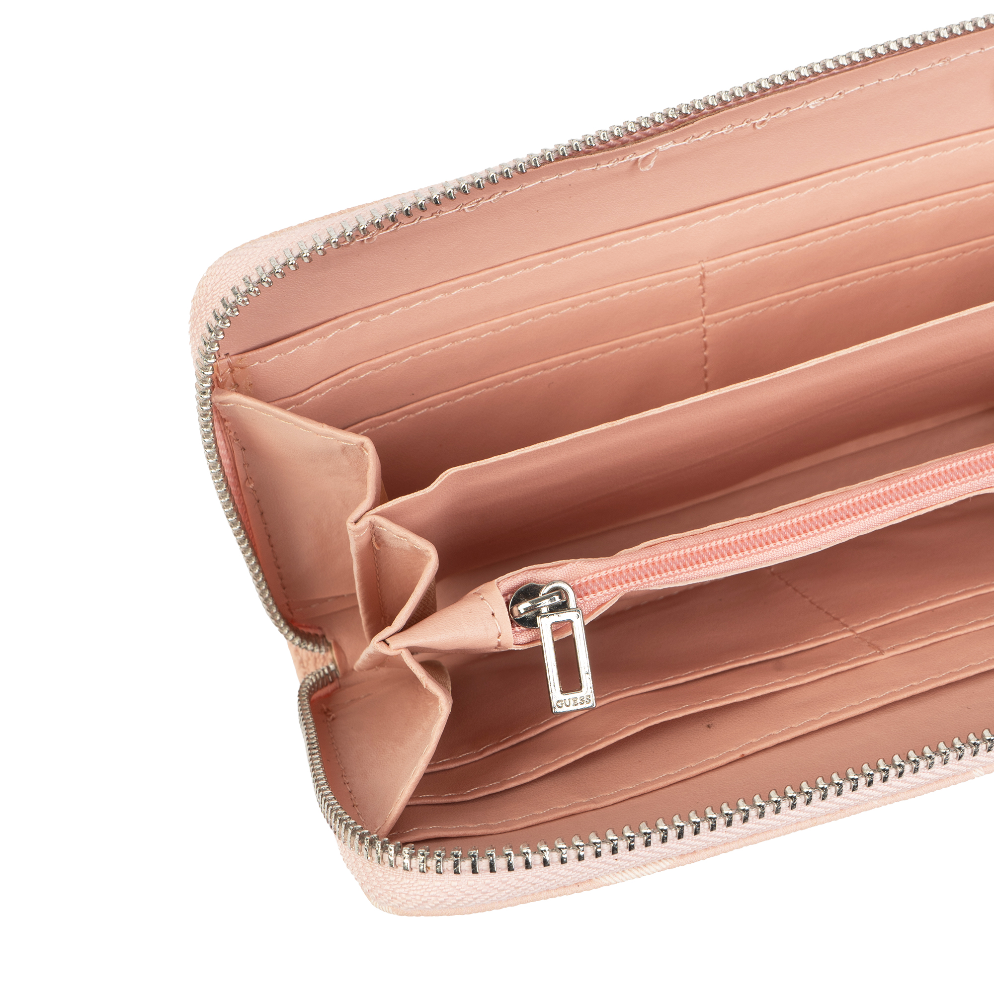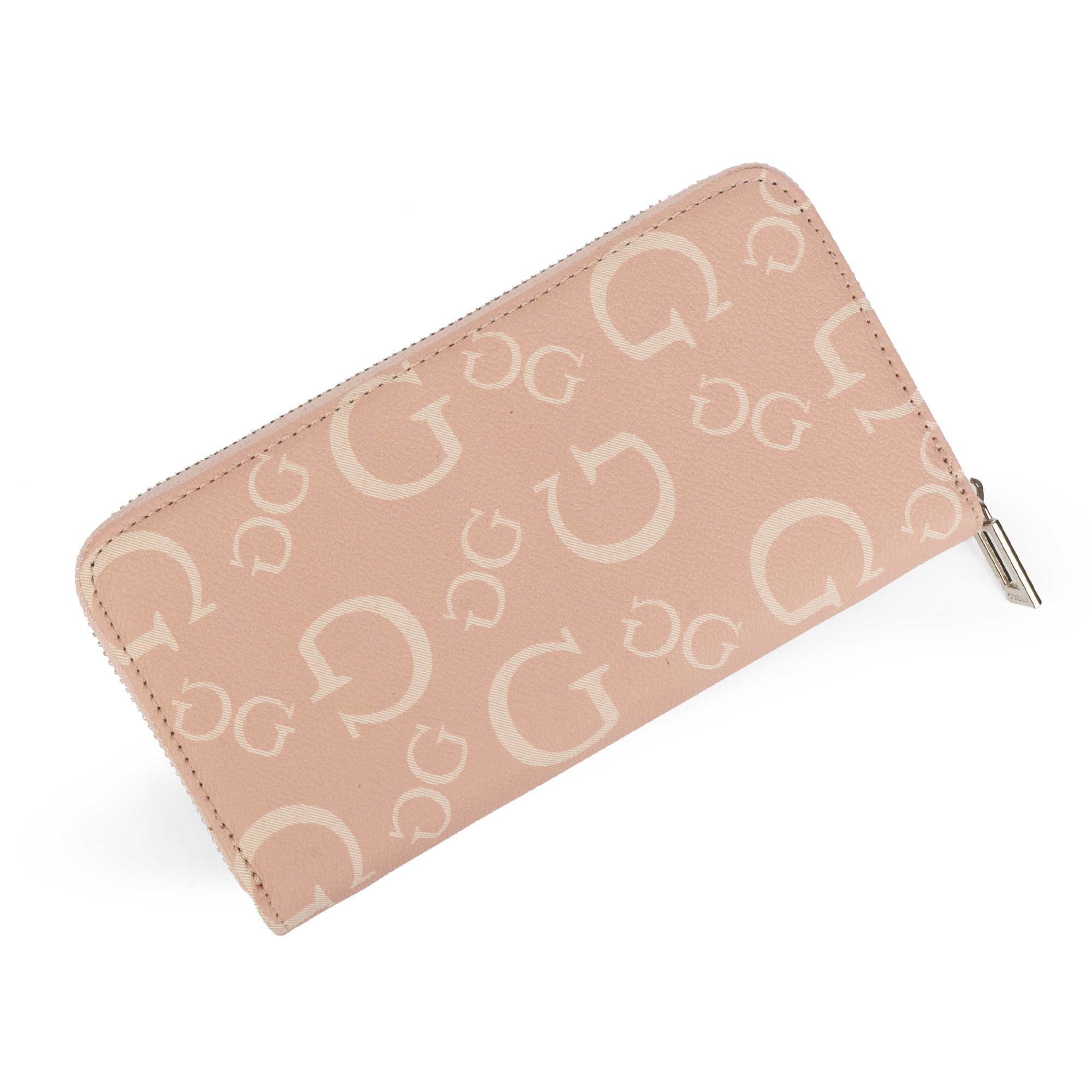 - التصميم: يتميز بطباعة شعار Guess “G” الشهير، غالبًا بنمط متكرر، مما يضيف مظهرًا جماليًا عصريًا ومعروفًا للمحفظة.
